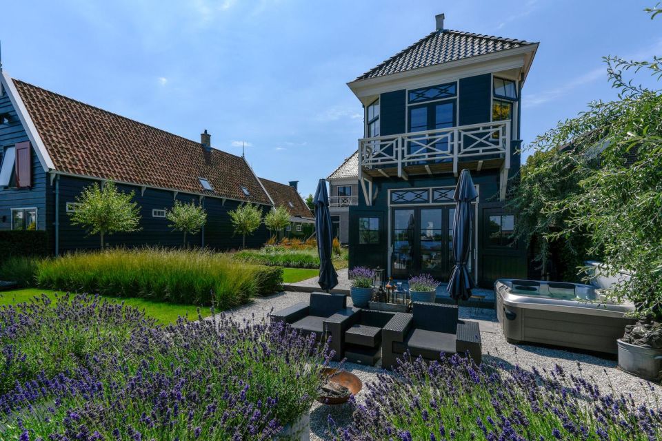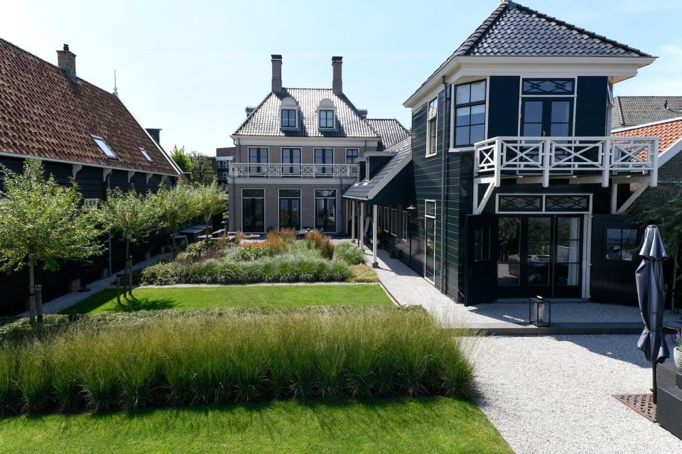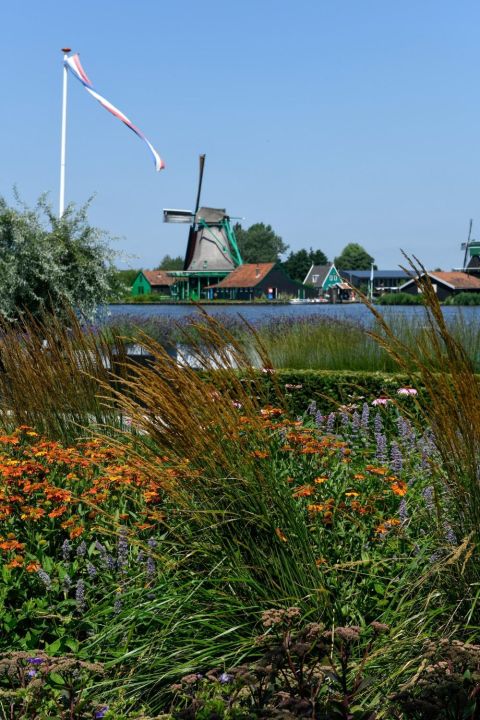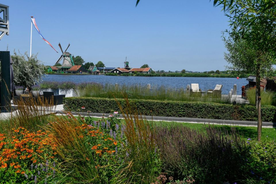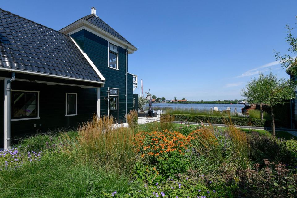 Tuinarchitect Andrew van Egmond ontwierp een stijlvolle tuin met uitzicht op het Zaanse landschap. De heldere vlakken, smalle paden en blauwe natuursteen geven rust en versterken het zicht op het water. De typisch Hollandse wilgen en rietsoorten zorgen ook in de wintermaanden voor een karakteristieke uitstraling.