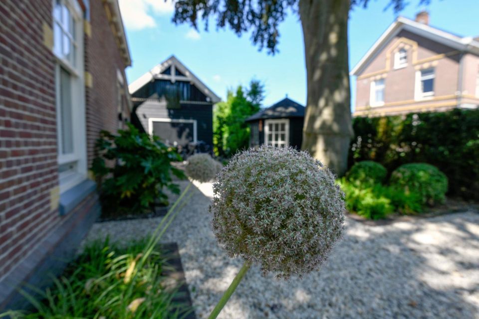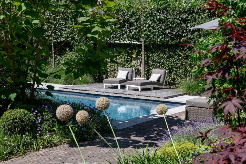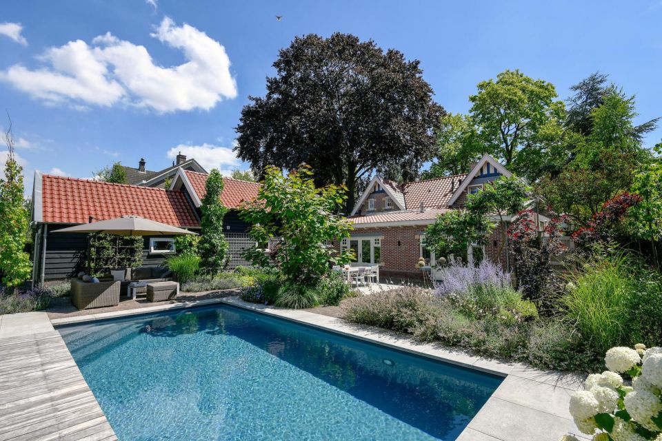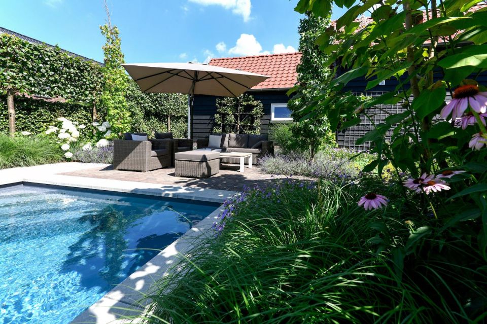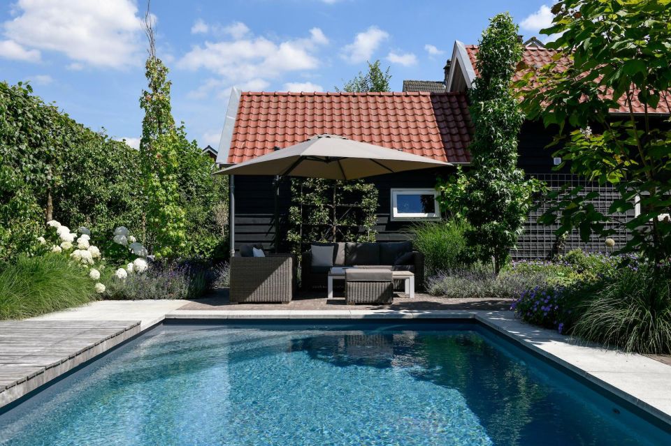 De achtertuin van deze Houtense woning geeft meteen een vakantiegevoel. Het zwembad heeft niet alleen een zonnedek, maar ook een comfortabele loungehoek. De borders zijn gevuld met halfhoge bomen en bloeiende planten, zodat ze de tuin kleur, diepte en beschutting geven. Het zwembad is daardoor maar deels zichtbaar vanuit de woning.