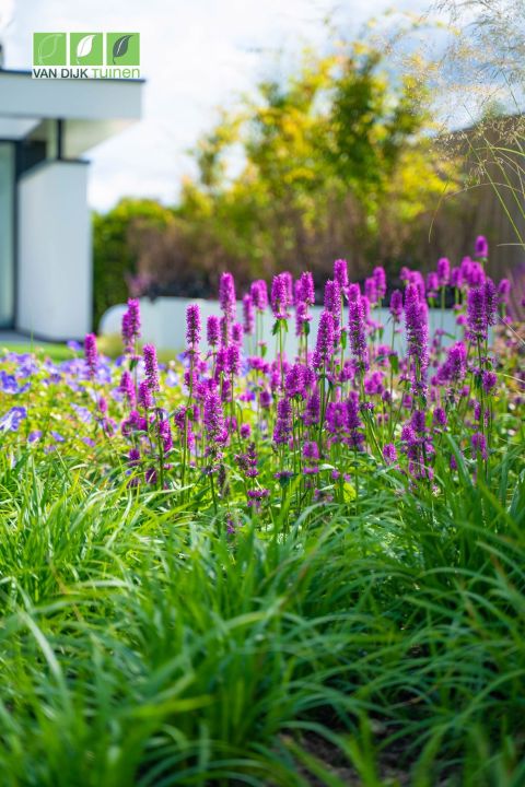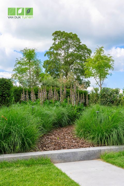 Door het gebruik van meerstammige heesters die solitair in de tuin staan, brengen we groen in de tuin, maar met behoud van licht. De bloemenperken geven gedurende het jaar mooie kleuren in de tuin. De planten zijn specifiek uitgezocht om bij de stijl van het huis passen.