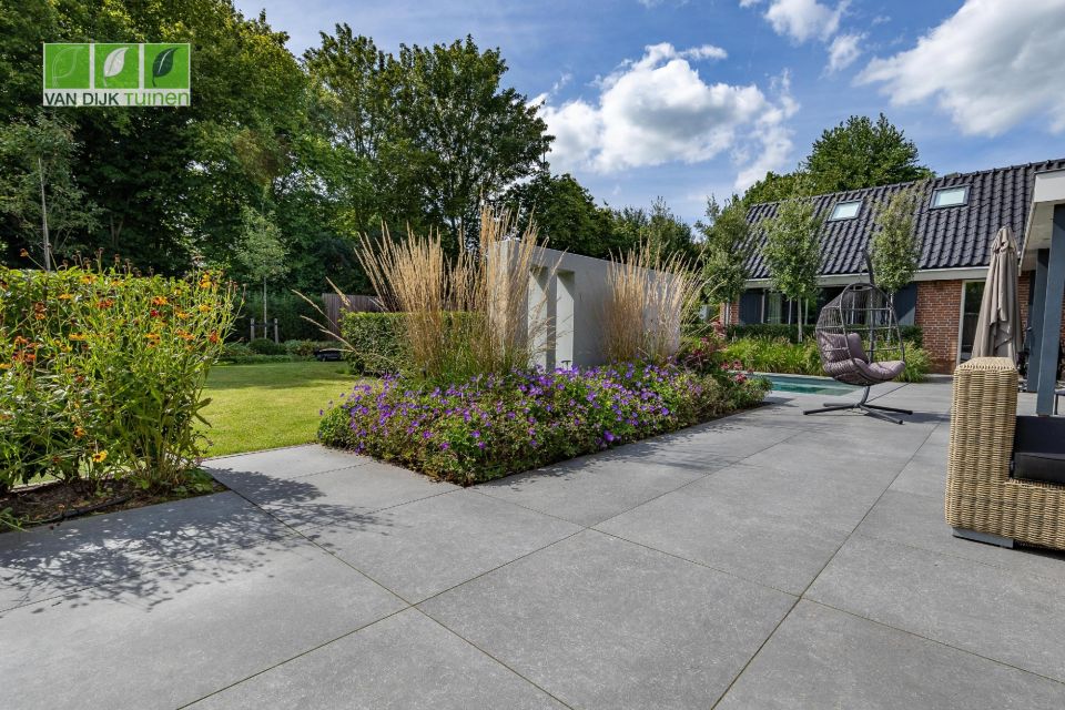 De grote keramische tegels van 90x90 cm zijn gevoegd waardoor er geen onkruid tussen kan groeien.