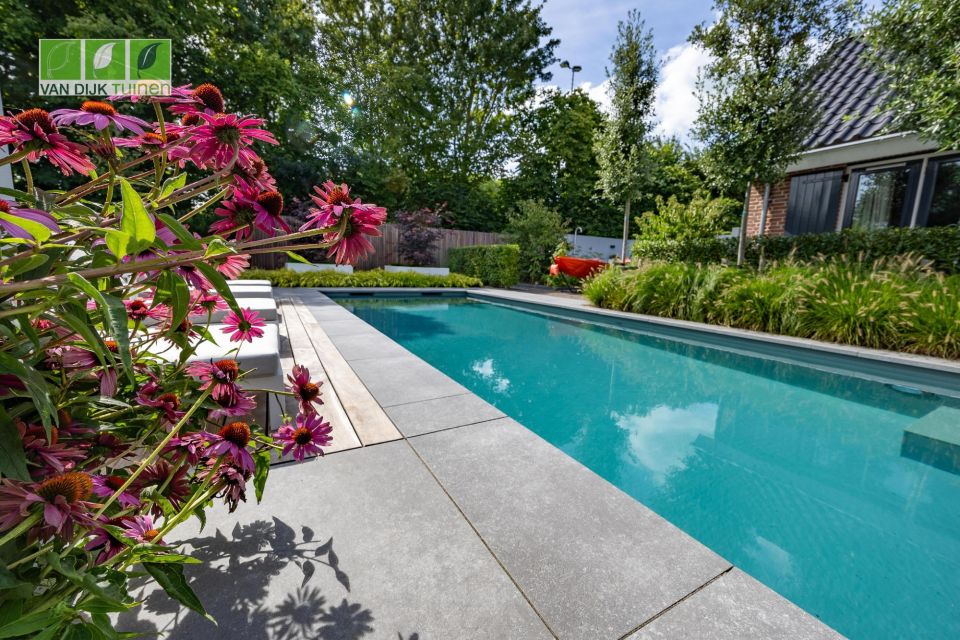 De zwembadrand is op maat gemaakt in dezelfde tegelsoort als het terras, waardoor er een eenheid ontstaat met een modern uiterlijk.