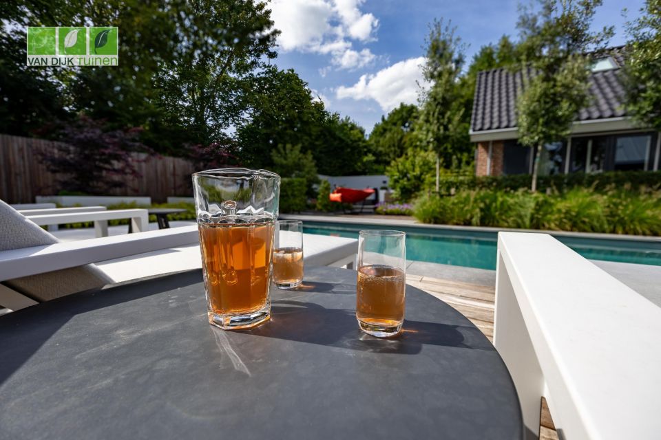 De witte (op maat gemaakte) muren in de zithoek en bij het zwembad zorgen voor intieme plekken en geven diepte aan de tuin. Naast het zwembad is er een ruim vlonderterras van hardhout aangelegd met 4 ligbedden. Een heerlijke plek waar je relaxed in de zon kunt liggen.