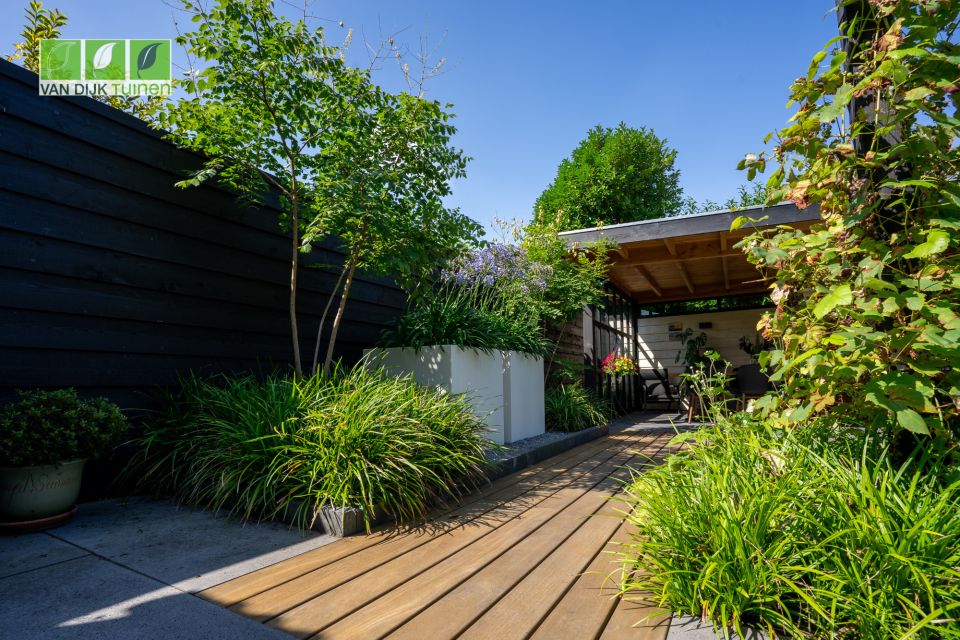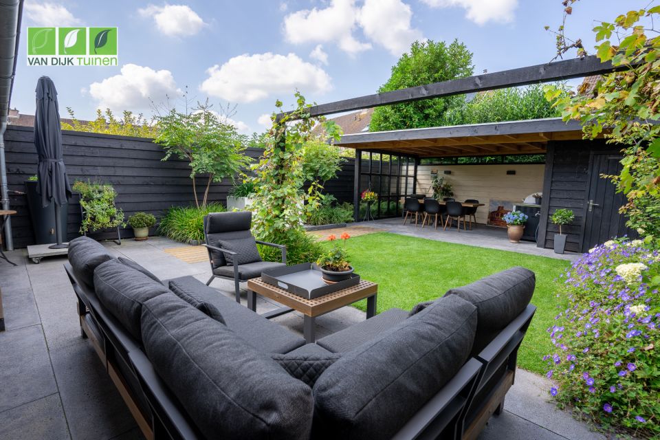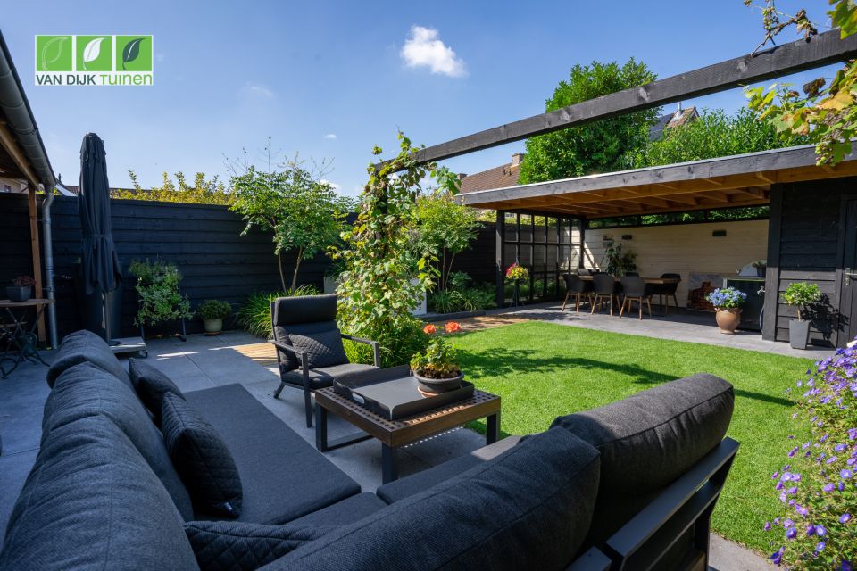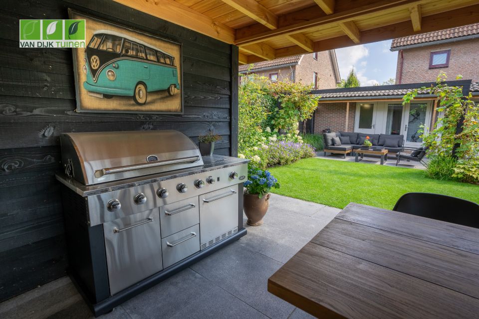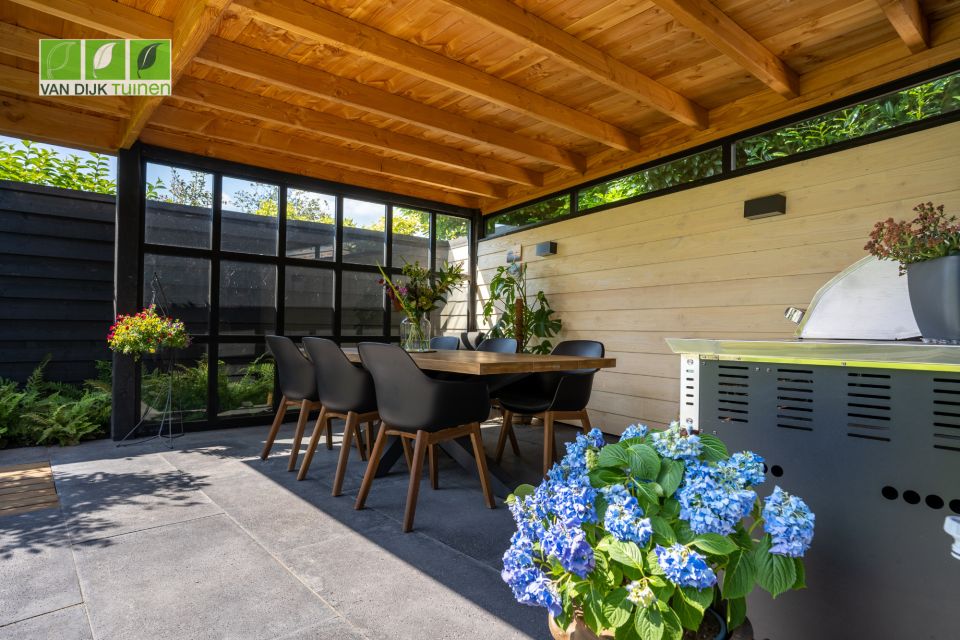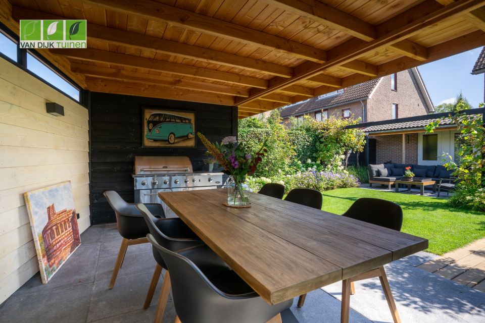 De bewoners waren nog geen klant bij ons en hebben na een bezoek aan onze showroom een wensenlijst opgesteld en moodboard gemaakt. Die (visuele) informatie hebben we samen met onze architect omgezet naar een prachtig ontwerp. De tuin is een 2e huiskamer geworden, mede door de overkapping aan het tuinhuis. Hier wordt niet alleen heerlijk gedineerd en geborreld, maar ook thuis gewerkt.