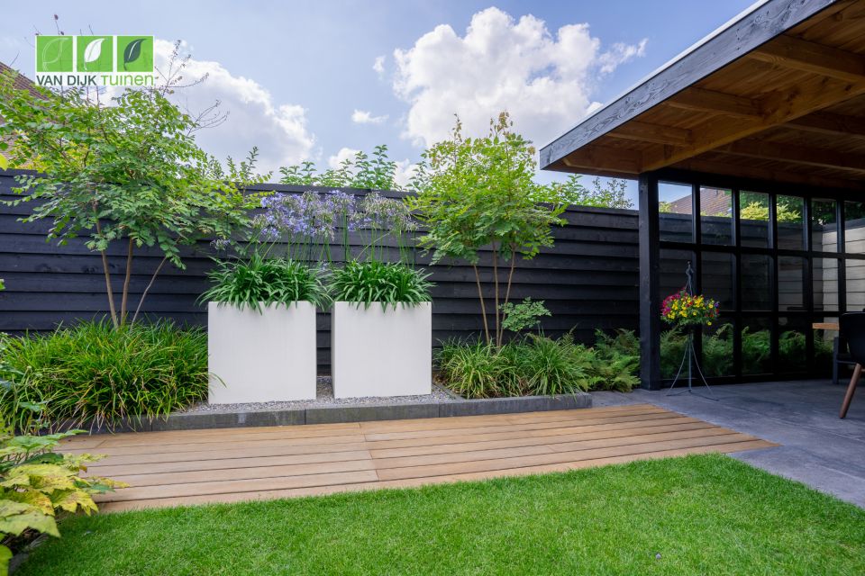 Een tuin aanleggen in Odijk is een heerlijk thuiswedstrijd. Voor onze hoveniers zijn dit mooie projecten waar zij zo'n twee a drie weken druk mee zijn. De oude tuin hebben we leeggehaald en daarna hebben we een compleet nieuwe privacy-beschermende tuin aangelegd. Dat is inclusief de schuttingen, verlichting, beregeningsinstallatie, slimme maairobot, de overkapping en het tuinhuis. Alles is op maat gemaakt.