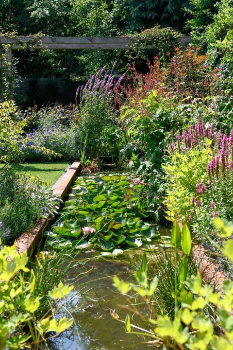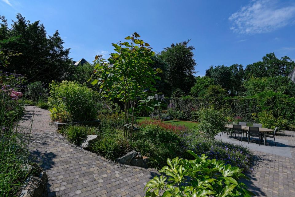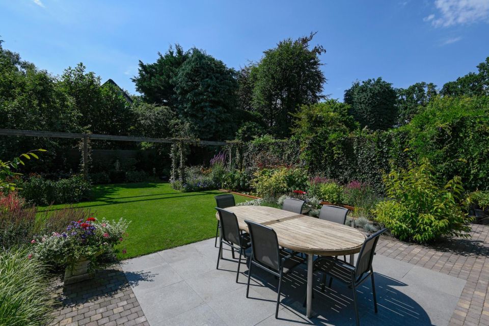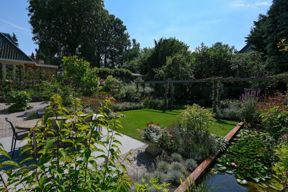 In elk seizoen kom je ogen tekort in deze royale, bloeiende plantentuin in Hilversum. Borders met een grote variatie aan vaste planten, bollen, groenblijvende en bladverliezende heesters. Een pergola met een roos en een clematis, die de tuin extra diepte geeft. Een vijver over de hele lengte, met een nieuwe op maat gemaakte cortenstale rand. De tuin is een feest voor bijen, vogels en vlinders.